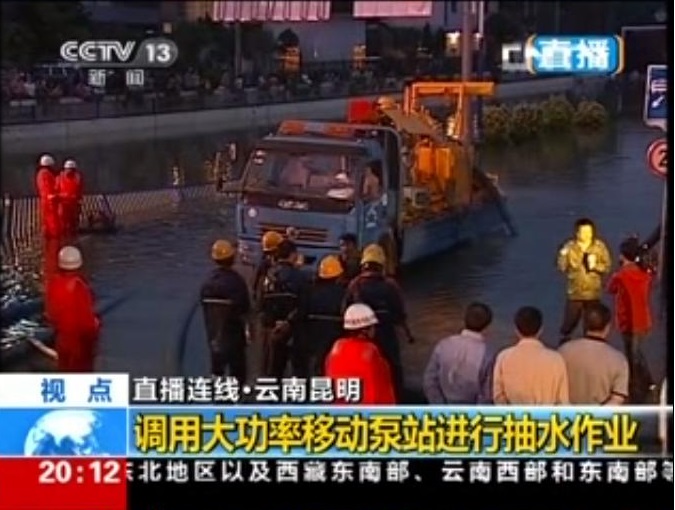 據(jù)央視7月19日“東方時空”新聞報道,從2013年7月18日早7點開始,云南昆明市降下了近4年以來最大的暴雨,12小時降雨量達190毫米,城區(qū)多處積水,交通受到嚴重影響。流經(jīng)城區(qū)的盤龍江流量是正常時期10倍左右,水位大幅上漲,導(dǎo)致江水倒灌。緊靠盤龍江的火車北站隧道是市區(qū)最大的淹水點,這條長300多米的汽車和行人通道積水20000立方米左右,最深處達5米。昆明市排水公司調(diào)來了全市唯一一臺大功率移動排水泵站投入搶險,經(jīng)過一夜的連續(xù)工作,在早高峰前排清了積水,恢復(fù)了該城市主干道交通。